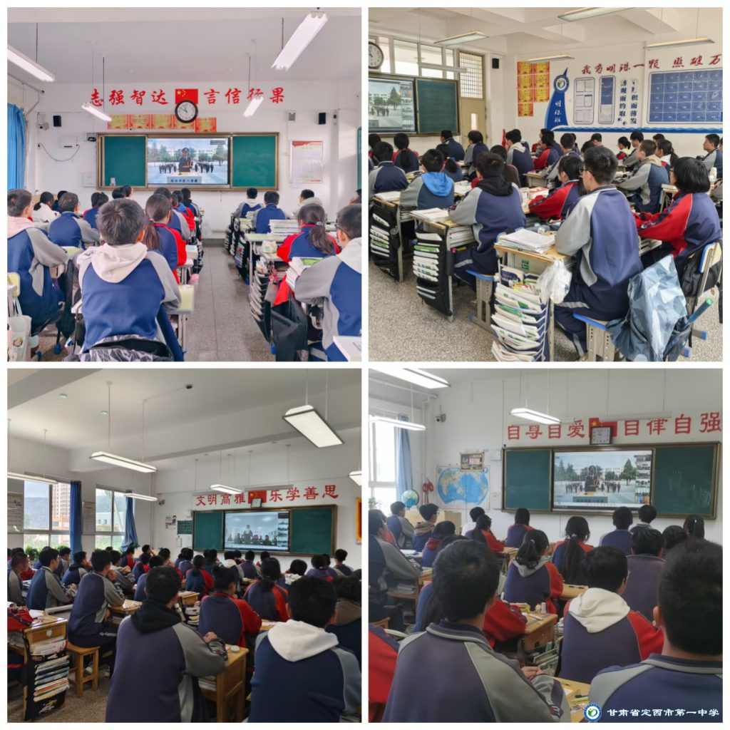 在第十二個烈士紀(jì)念日這個莊嚴(yán)時刻,我校與安定區(qū)東關(guān)小學(xué)、西關(guān)小學(xué)及青島92677部隊海防官兵跨越山河,聯(lián)合開展“同升國旗,強(qiáng)國有我”線上主題活動,共同緬懷英烈,砥礪強(qiáng)國之志。上午9時50分,在雄壯的國歌聲中,五星紅旗在定西一中主會場升起,三校師生與邊防官兵線上線下同步參與。