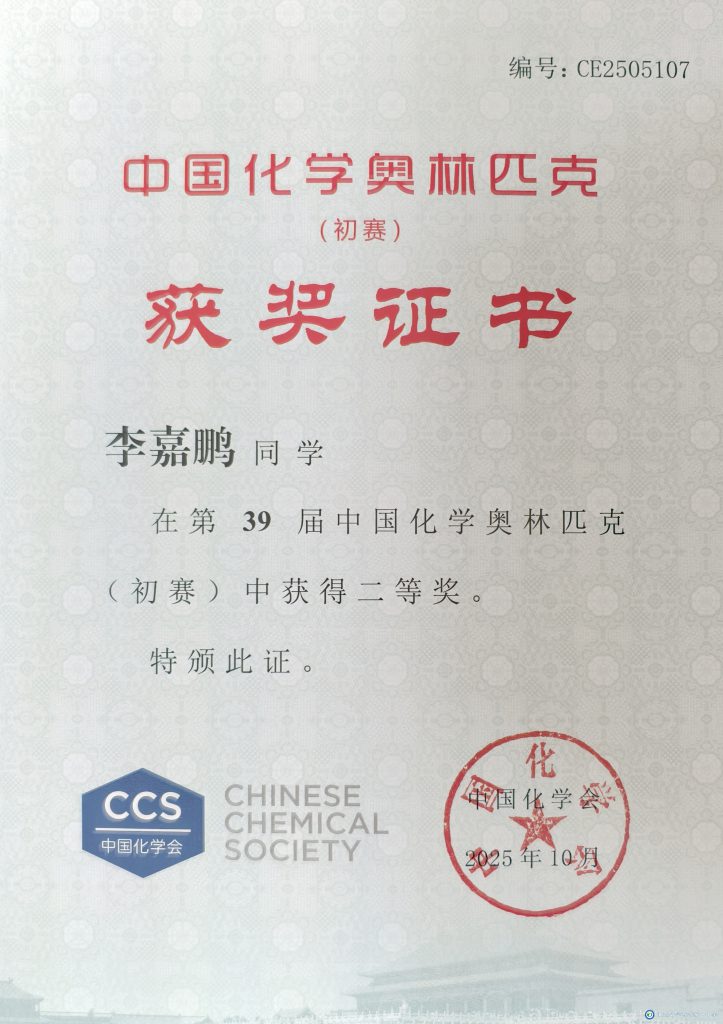 喜報——我校學子在第39屆中國化學奧林匹克競賽甘肅聯(lián)賽中榮獲佳績 時間:2025-12-17 分類:三抓三促/ 教研成果 在2025年第39屆中國化學奧林匹克競賽甘肅聯(lián)賽中,我校1人獲省級一等獎,1人獲省級二等獎,5人獲省級三等獎。 (撰稿:董立順 審核:王景龍 田永強 監(jiān)審:水晶) 分享: 上一個: 喜報——我校學子在2025年第42屆全國中學生物理競賽甘肅聯(lián)賽中榮獲佳績 相關文章 喜報——我校學子在2025年第42屆全國中學生物理競賽甘肅聯(lián)賽中榮獲佳績 定西一中“對話名校 筑夢未來”系列活動|哈爾濱工業(yè)大學專場 【區(qū)域聯(lián)動 眾行致遠】智慧共享 ?智研共贏 【研經(jīng)悟理 授業(yè)傳道】廣學集智逐光行,求變則通耘夢田 【“三抓三促”行動進行時】定西一中校報2025年第八期 【“三抓三促”行動進行時】師徒同心展匠心 青藍攜手綻芳華 【“三抓三促”行動進行時】幫扶搭臺連校際 互鑒同行共育人 【“三抓三促”行動進行時】區(qū)域聯(lián)動促深度交流?攜手并進謀共同發(fā)展
